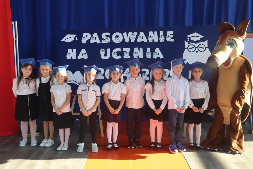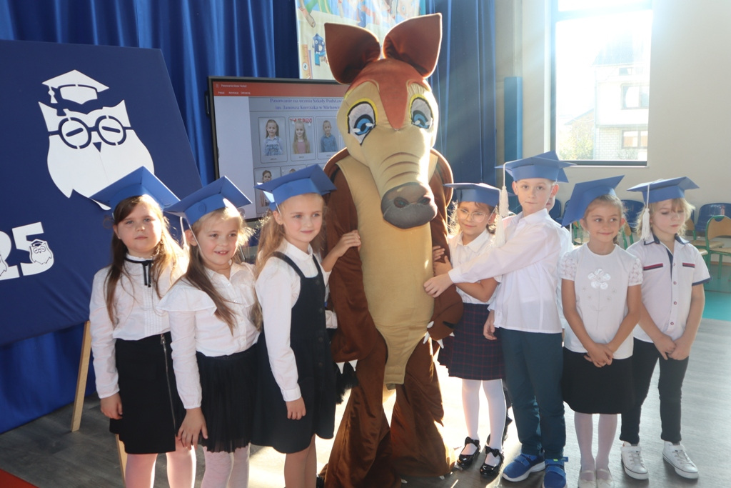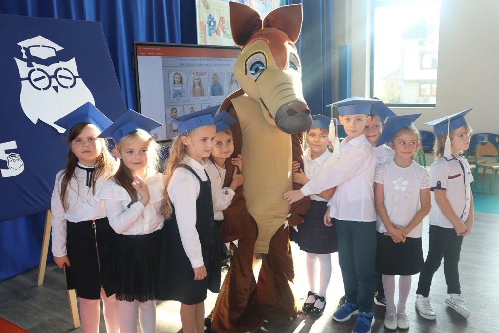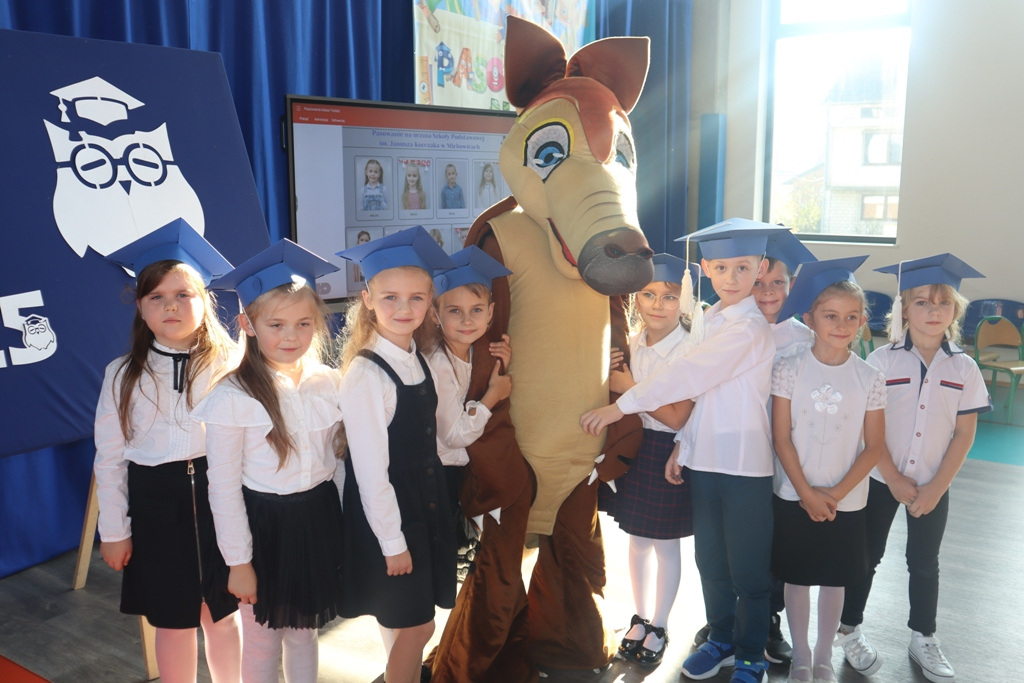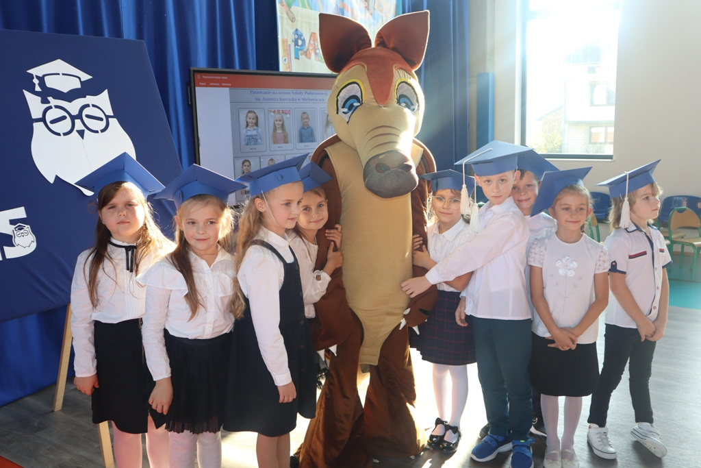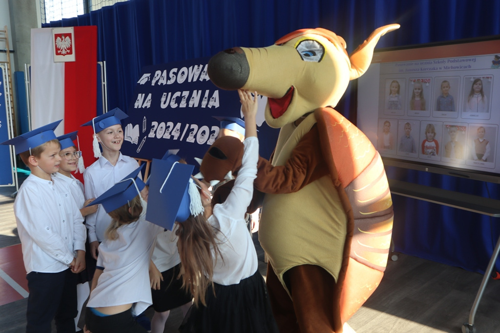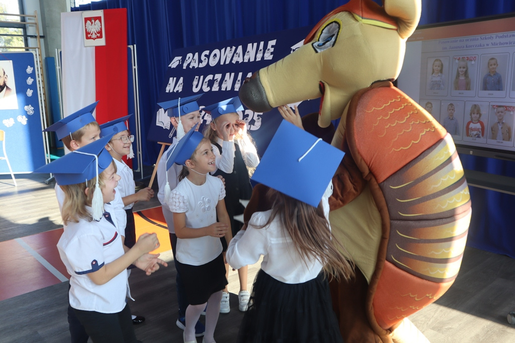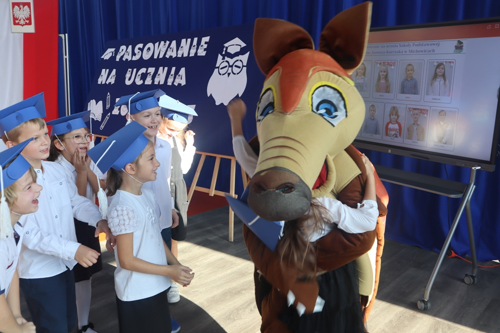 Zastępca Wójta p. Magdalena Piekut, Skarbnik Gminy p. Ewa Milczarek przewodnicząca Rady Rodziców p. Agnieszka Leszczyńska, dyrektor naszej szkoły p. Beata Filutowska, rodzice pierwszoklasistów oraz uczniowie klas 0-III z wychowawczyniami. Po oficjalnej części powitania gości przez panią Dyrektor, pierwszoklasiści zaprezentowali swoje artystyczne umiejętności, a zgromadzona widownia nagrodziła małych aktorów głośnymi brawami.Dzisiejszą uroczystość prowadziła uczennica klasy IV Celina Gołębiowska, której należą się serdeczne podziękowania. Najważniejszym momentem było ślubowanie na sztandar szkoły. Aktu pasowania na ucznia Szkoły Podstawowej im. Janusza Korczaka w Michowicach dokonała pani Dyrektor. Uczniowie otrzymali pamiątkowe dyplomy, a pani Dyrektor wręczyła legitymacje szkolne. Pierwszoklasiści nie zapomnieli również o swoich rodzicach, którym serdecznie podziękowali, recytując krótki, wzruszający wiersz, a także śpiewając piosenkę i wręczając własnoręcznie wykonane upominki.Po oficjalnej uroczystości bohaterowie tego dnia otrzymali piękne prezenty od zaproszonych gości,Rady Rodziców i od kolegów z klas 0 – III. Dużą niespodzianką dla wszystkich, a szczególnie dla pierwszoklasistów, były odwiedziny maskotki SKO ”Pancernika Hatetepesa”, którego każdy chciał przywitać i przytulić. Pierwszoklasiści otrzymali prezenty również od dziewczynek z aktywu SKO.