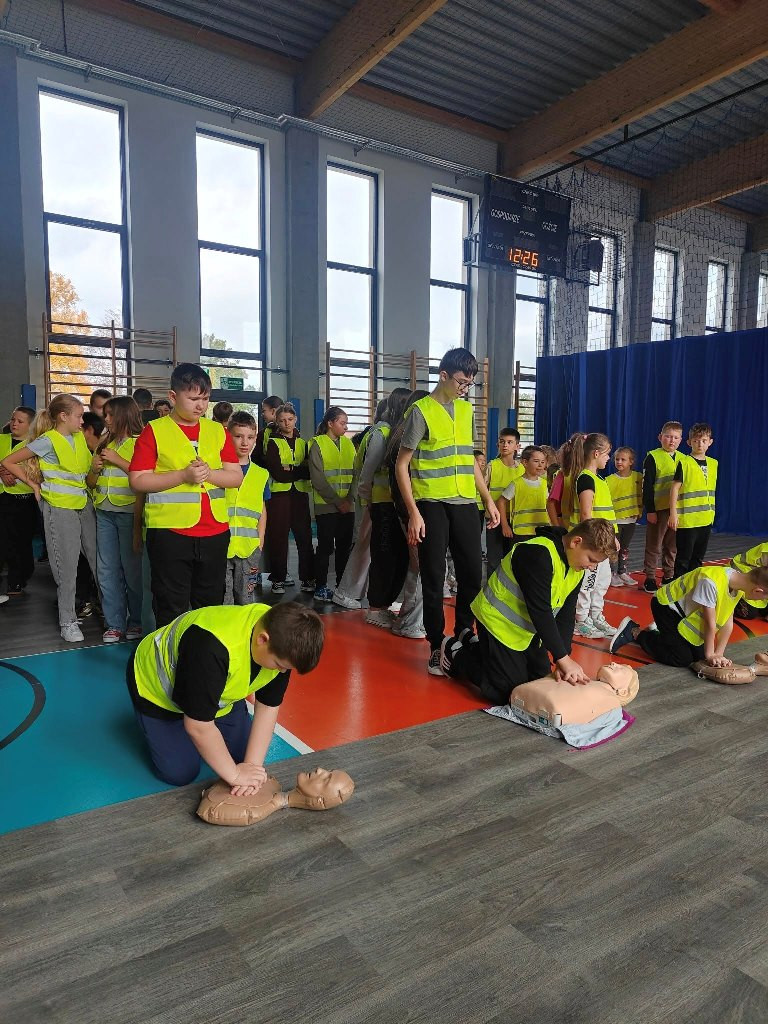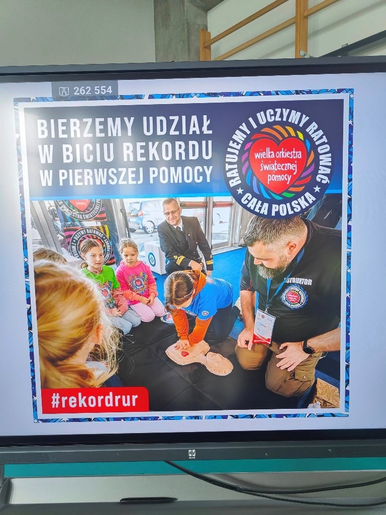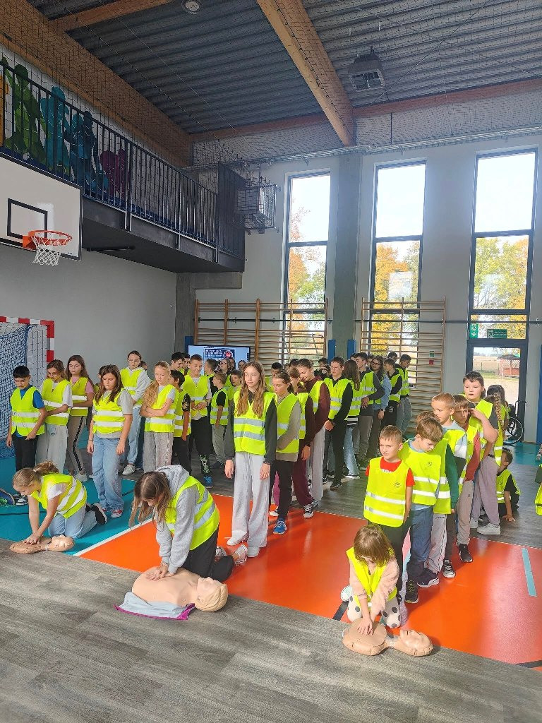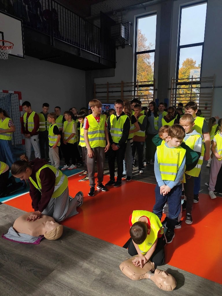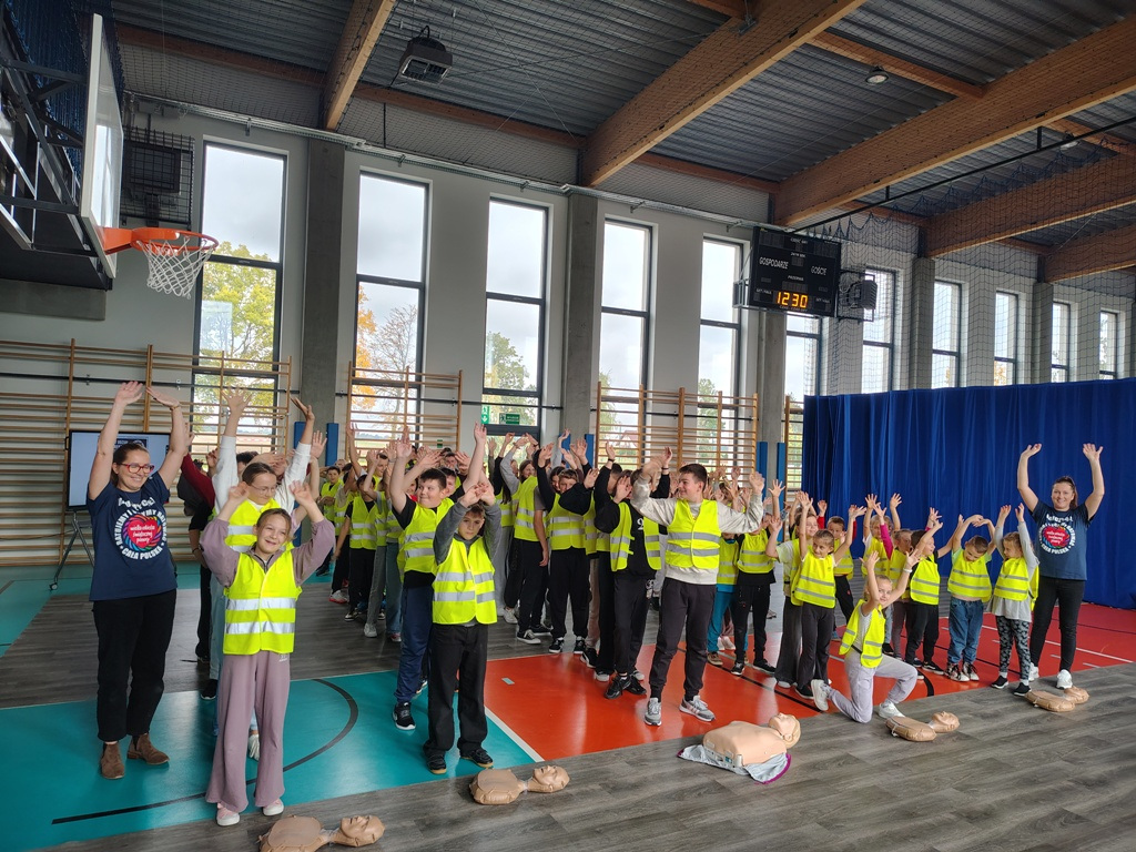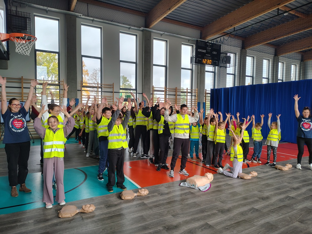 Dziś nasza szkoła wzięła udział w wyjątkowej akcji bicia rekordu w Pierwszej Pomocy, organizowanej przez Fundację WOŚP w ramach Europejskiego Dnia Przywracania Czynności Serca. To wydarzenie jest częścią programu „Ratujemy i Uczymy Ratować”. Uczniowie, nauczyciele połączyli siły, by pobić rekord w udzielaniu pierwszej pomocy. To nie tylko świetna zabawa, ale przede wszystkim nauka ratowania życia i dbania o bezpieczeństwo na drodze. Uczniowie prowadząc nieprzerwanie przez pół godziny RKO, uratowali wiele ludzkich istnień. W ramach akcji ćwiczyliśmy w kamizelkach odblaskowych, bo życie udzielającego pomocy jest tak samo ważne, jak tego kto tej pomocy potrzebuje.
