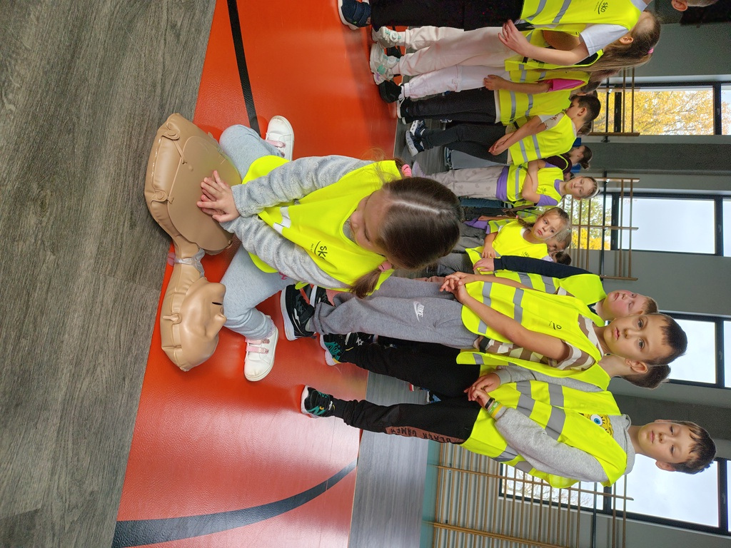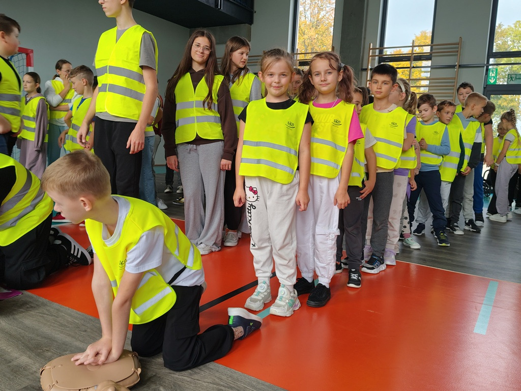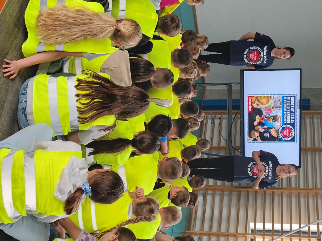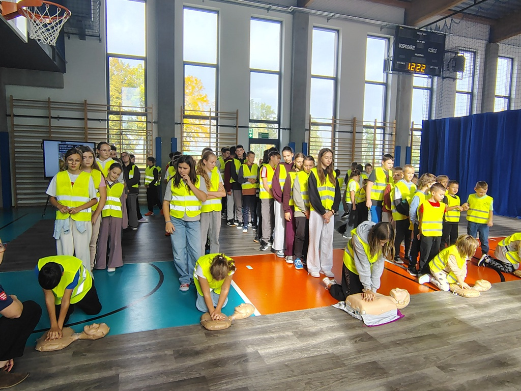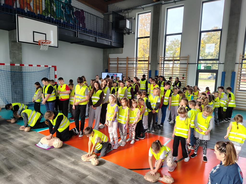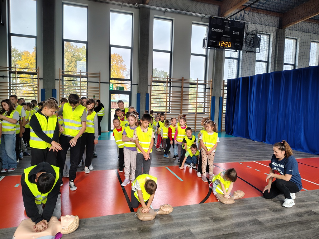 Dziś nasza szkoła wzięła udział w wyjątkowej akcji bicia rekordu w Pierwszej Pomocy, organizowanej przez Fundację WOŚP w ramach Europejskiego Dnia Przywracania Czynności Serca. To wydarzenie jest częścią programu „Ratujemy i Uczymy Ratować”. Uczniowie, nauczyciele połączyli siły, by pobić rekord w udzielaniu pierwszej pomocy. To nie tylko świetna zabawa, ale przede wszystkim nauka ratowania życia i dbania o bezpieczeństwo na drodze. Uczniowie prowadząc nieprzerwanie przez pół godziny RKO, uratowali wiele ludzkich istnień. W ramach akcji ćwiczyliśmy w kamizelkach odblaskowych, bo życie udzielającego pomocy jest tak samo ważne, jak tego kto tej pomocy potrzebuje.