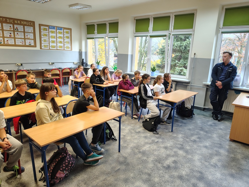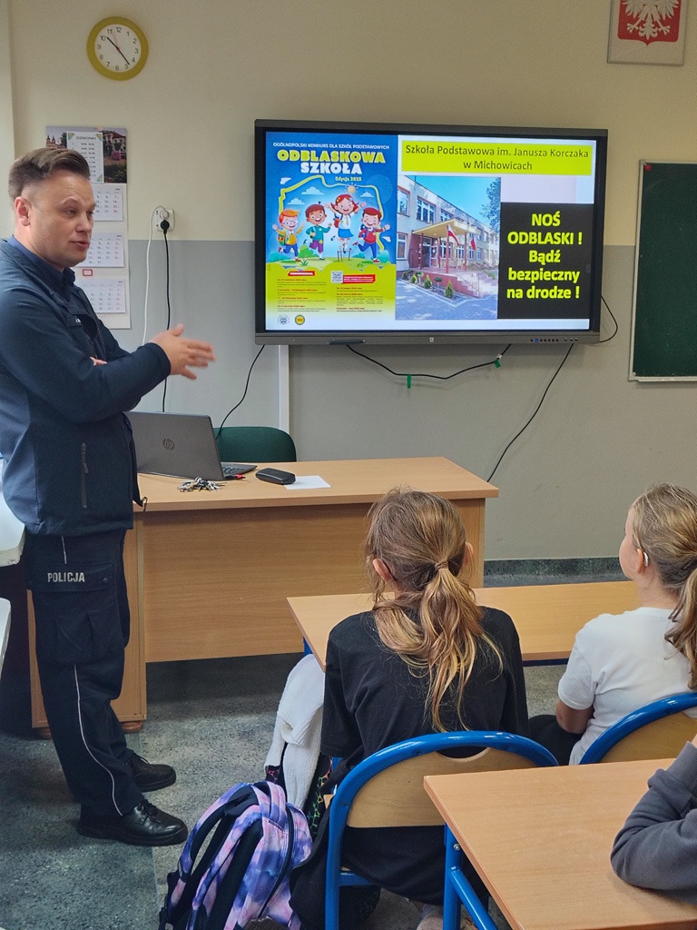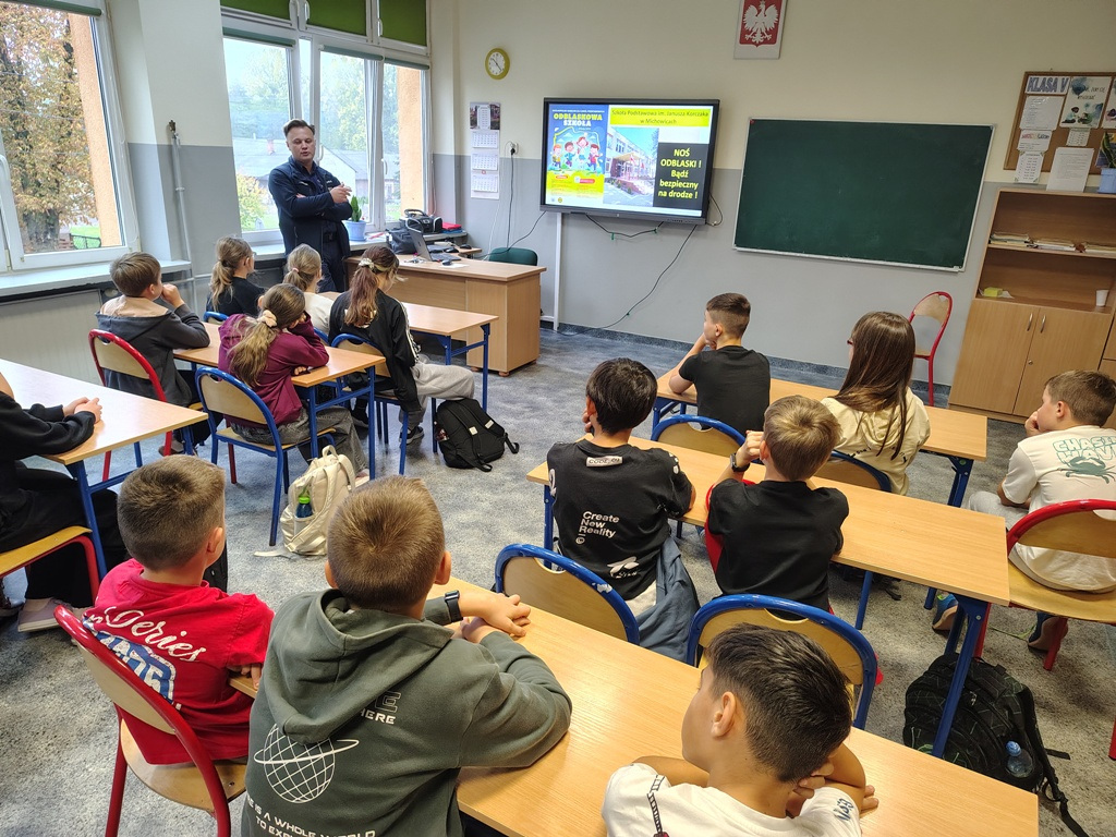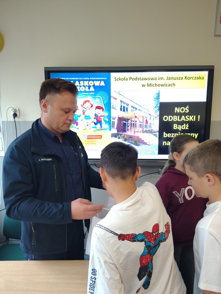 W dniu 24 października 2025 roku uczniowie kl. V i VI spotkali się z dzielnicowym asp. sztab. Jerzym Buczyńskim. Spotkanie profilaktyczne odbyło się w ramach akcji konkursowej „Odblaskowa Szkoła 2025”, której celem jest promowanie bezpieczeństwa pieszych i rowerzystów oraz uświadamianie dzieciom, jak ważne jest noszenie elementów odblaskowych.