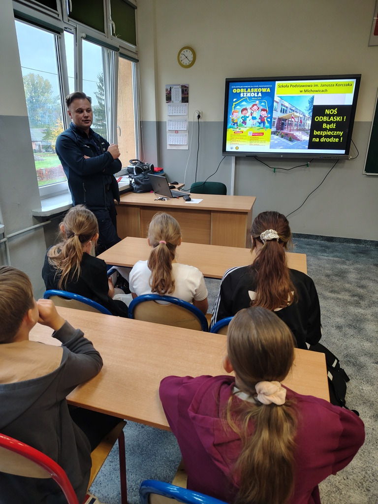 Podczas spotkania uczniowie obejrzeli przygotowaną z tej okazji prezentację multimedialną pt. „Noś odblaski! Bądź widoczny na drodze!”, dyskutowali o bezpieczeństwie na drodze i przypomnieli zasady bezpiecznego poruszania się po zmroku. W trakcie zajęć policjant tłumaczył, jak istotne jest bycie widocznym dla innych użytkowników ruchu drogowego oraz jak nawet niewielki element odblaskowy może uratować życie. Funkcjonariusz przypomniał podstawowe zasady ruchu drogowego, zwracając uwagę na obowiązek noszenia odblasków poza obszarem zabudowanym. Dzielnicowy uświadomił uczniom, że bezpieczeństwo na drodze zależy w dużej mierze od nich samych, a noszenie odblasków to prosty, ale bardzo skuteczny sposób na uniknięcie tragedii. Każdy uczestnik spotkania miał również okazję zadać pytanie policjantowi i porozmawiać o jego codziennej służbie. Na zakończenie spotkania każdy uczeń otrzymał pamiątkowy odblask.