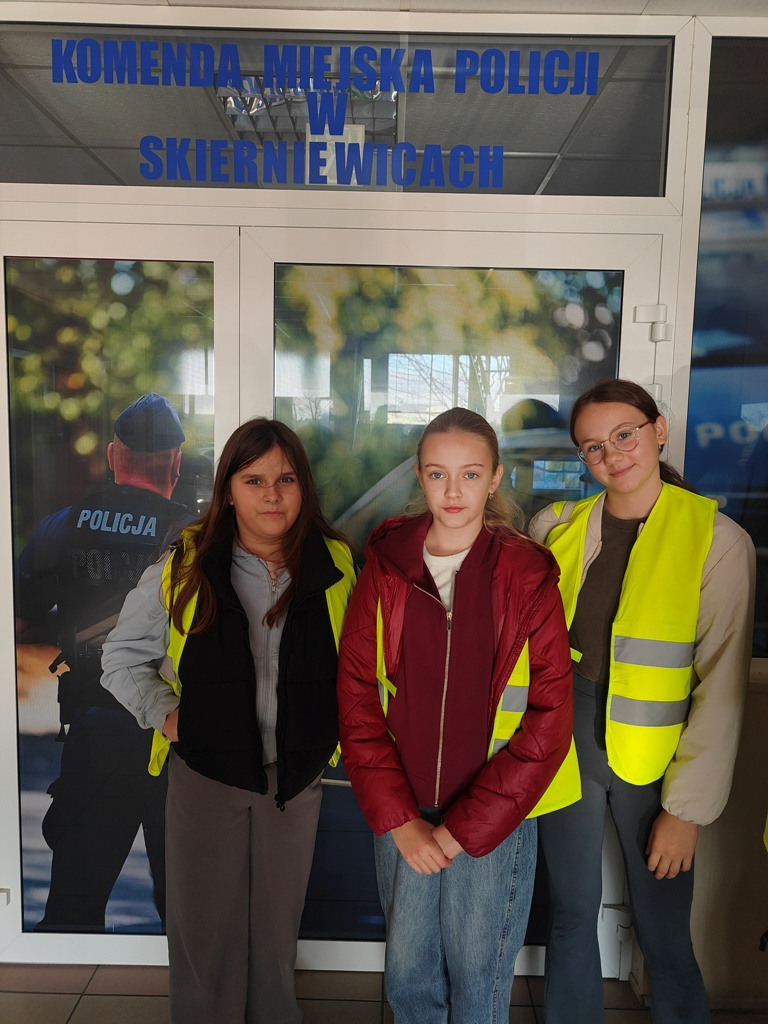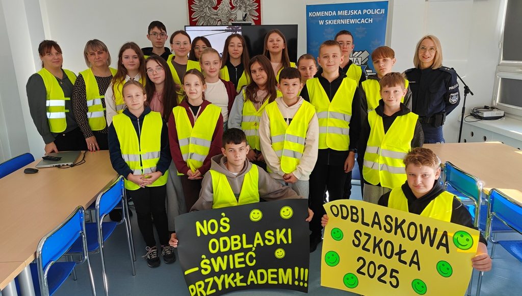 Dziś uczniowie klasy V i VIII odwiedzili Komendę Miejską Policji w Skierniewicach w ramach ogólnopolskiego konkursu „Odblaskowa szkoła 2025”.