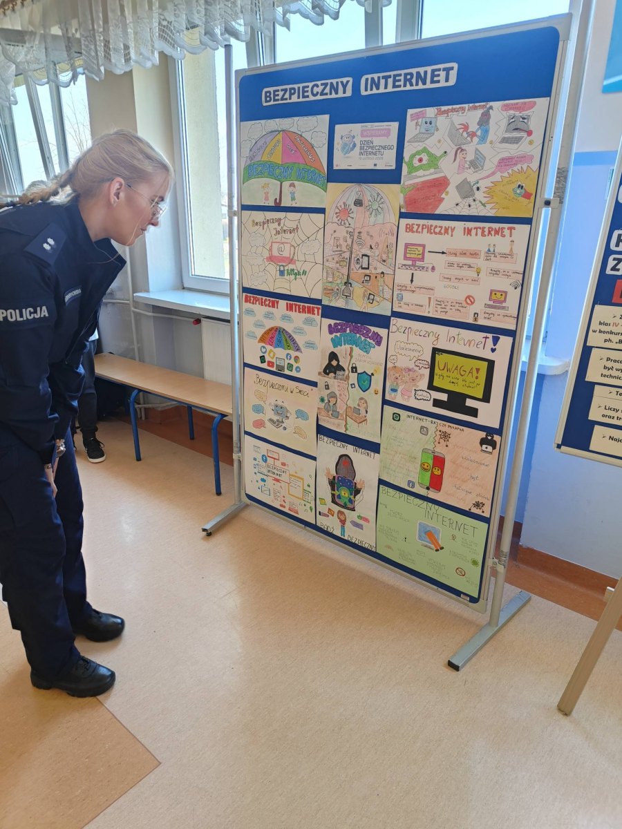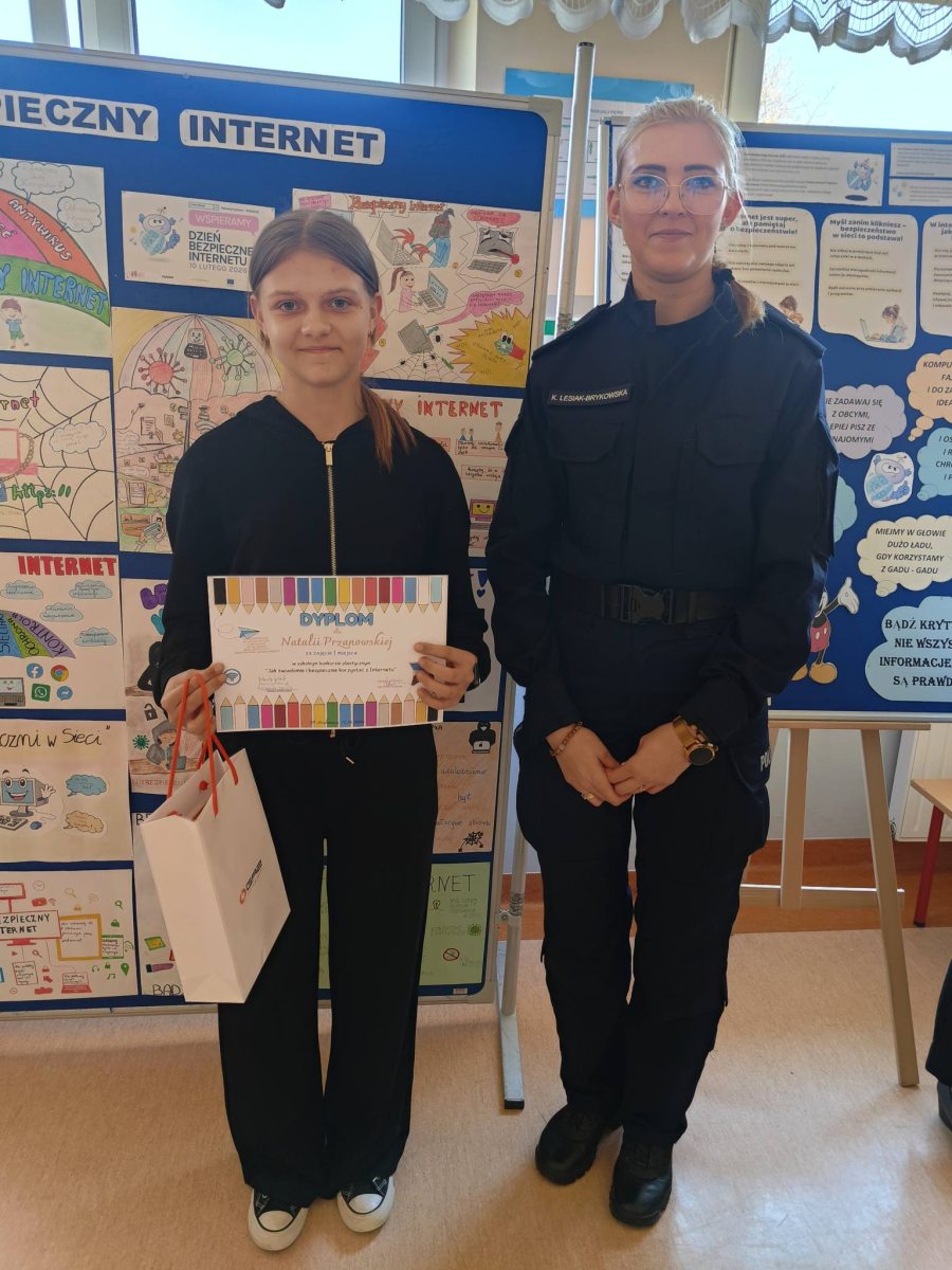 Korzystając z obecności w naszej szkole pani podkomisarz Katarzyny Lesiak – Brykowskiej z Centralnego Biura Zwalczania Cyberprzestępczości – zarząd w Łodzi, odbyło się podsumowanie szkolnego konkursu na wykonanie plakatu pod hasłem „Jak bezpiecznie i świadomie korzystać z Internetu?”.
